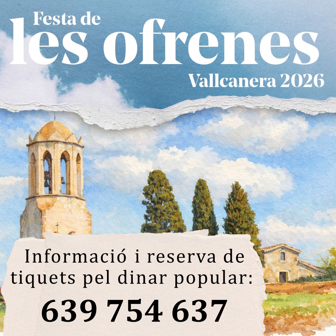 Aquest diumenge dia 22 de març es celebra a Vallcanera la tradicional Festa de les Ofrenes. La programació inclou un deliciós dinar a les 14.00h a la plaça del Centre Cívic de Vallcanera, després de la missa i el vermut, i seguit per una actuació musical a càrrec de Sam i una audició de sardanes per part de La Bisbal Jove.