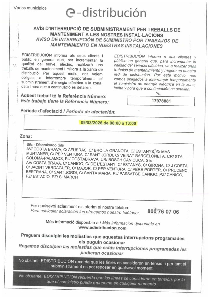 Actualitat AVÍS D’INTERRUPCIÓ DE SUBMINISTRAMENT ELÈCTRIC 09/03/2026 - 09/03/2026 < Entrada AnteriorEntrada Posterior >