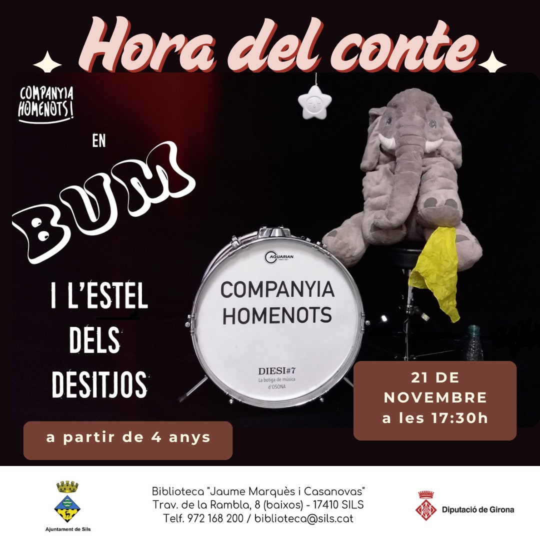 Agenda ÉS L’HORA DELS CONTES! 21/11/2025 - 21/11/2025 | Biblioteca Sils Amb més de deu anys d’història, la “Companyia Homenots” ens planteja una divertida manera d’introduir els nens i les nenes en l’apassionant món de la bateria i la percussió. Els adults també hi esteu convidats! < Entrada Anterior