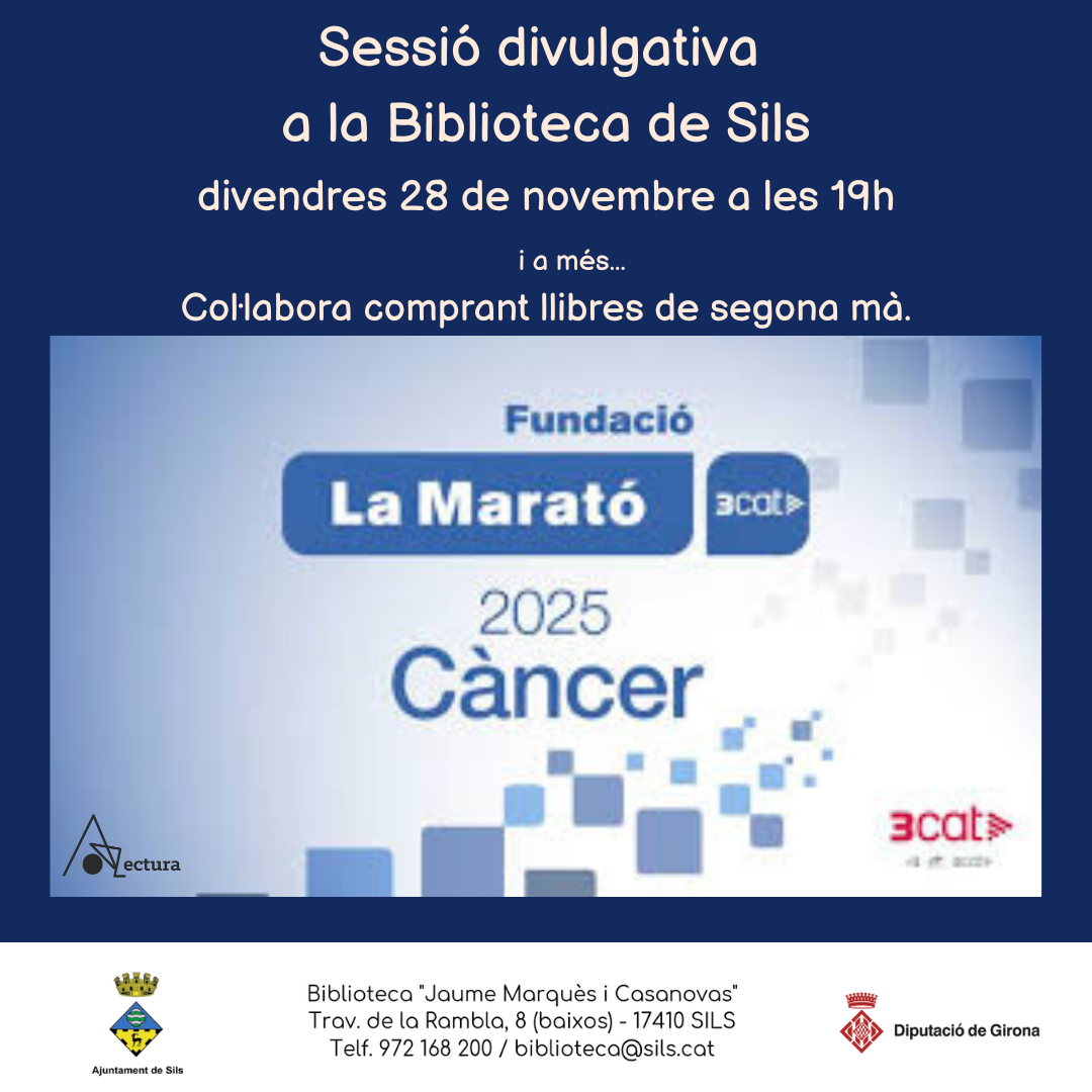Agenda Sessió divulgativa sobre el Càncer i venda de llibres de segona mà. La Marató 2025 28/11/2025 - 28/11/2025 | Biblioteca Jaume Marquès i Casanovas < Entrada AnteriorEntrada Posterior >
