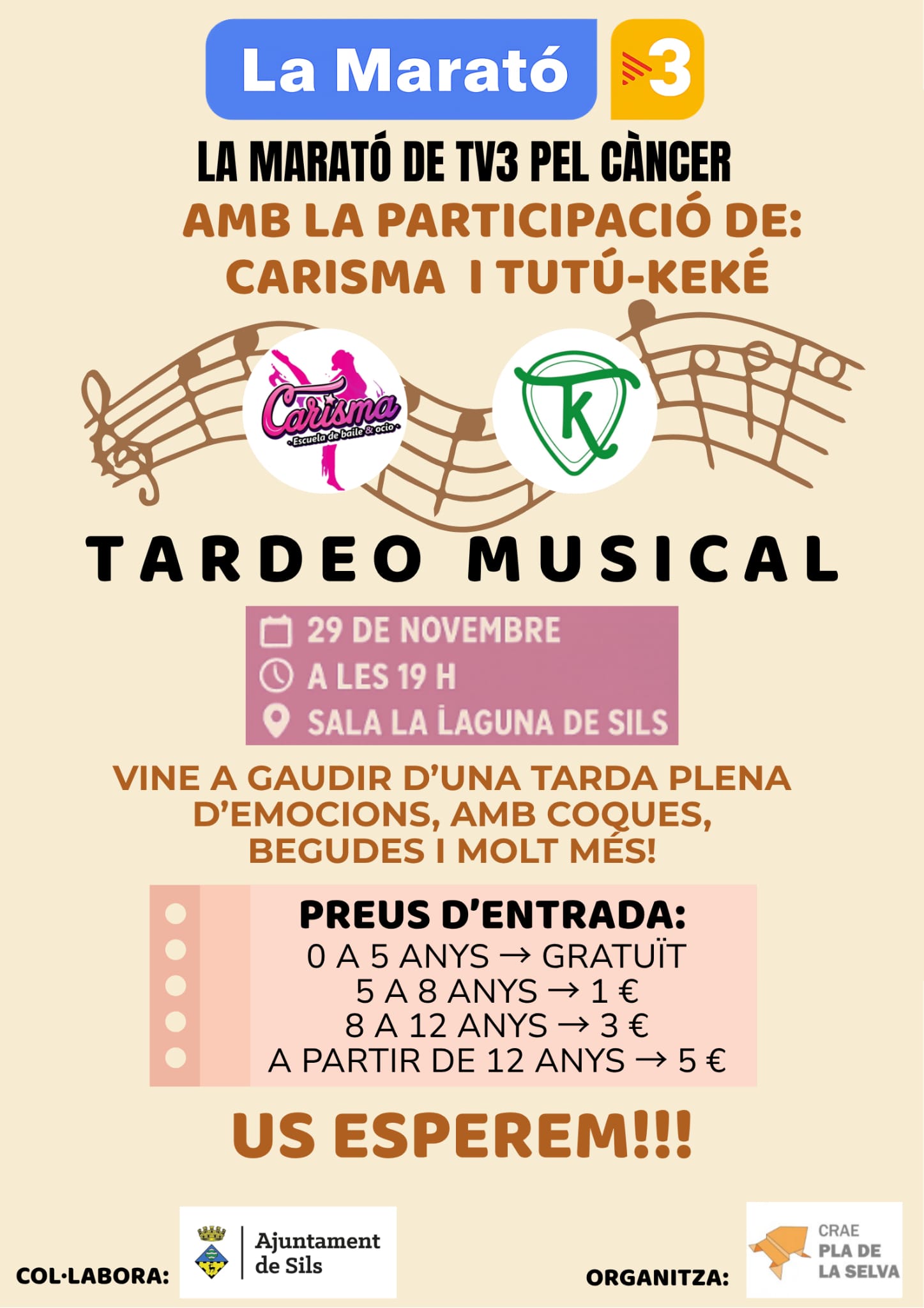 Des del CRAE Pla de la Selva, amb la col·laboració de l’escola de ball Carisma i el grup Tutú-Keké, i el suport de l’Ajuntament de Sils, el dia 29 de novembre a les 19h han organitzat un “tardeo” amb  ball, música i molt més!